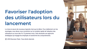 Débloquez le succès en apprenant les actions clés à prendre avant le lancement pour favoriser l'adoption par les utilisateurs, réduire la résistance et garantir une mise en œuvre fluide du logiciel.